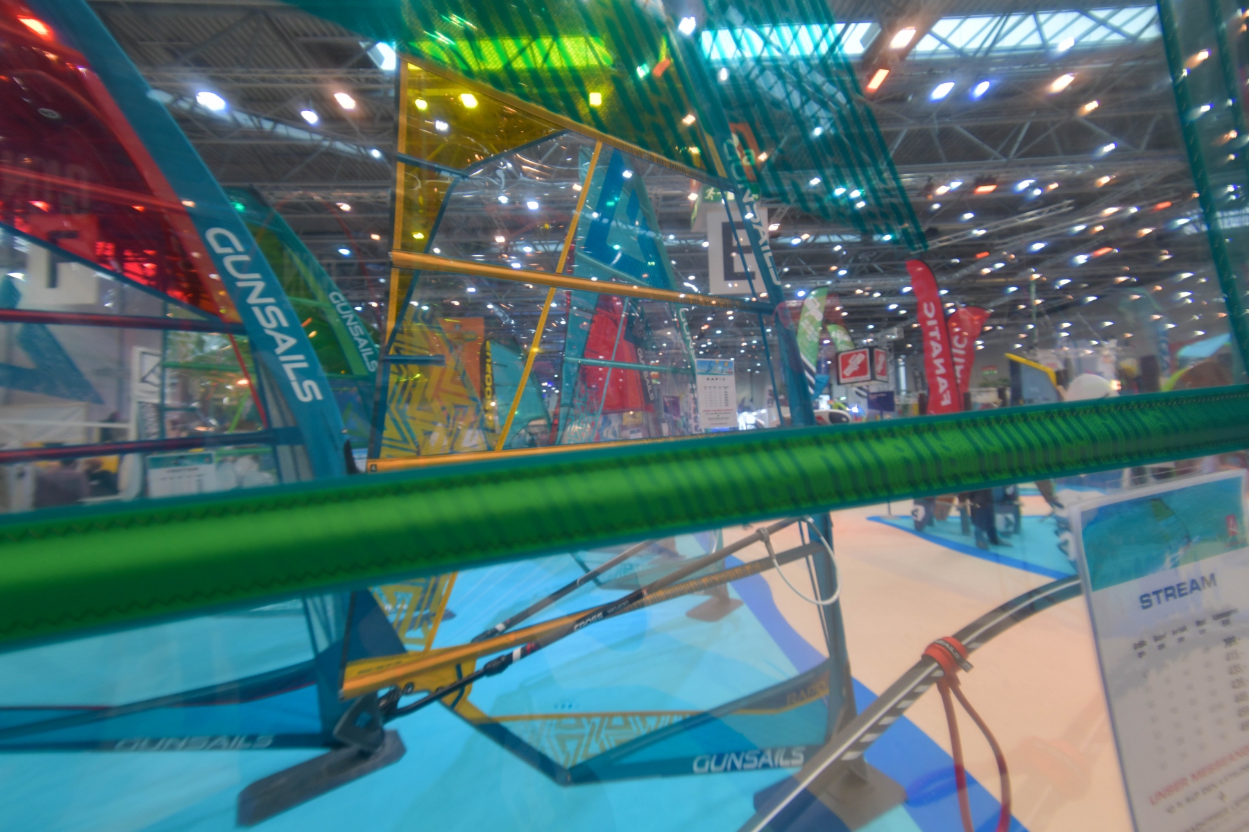 Der neueste Trend im Wassersport ist das „Wingsurfen“. Auf einem SUP-Board, einem Surf- oder Kiteboard und möglichst mit Foil geht es aufs Wasser. Der Wing ähnelt einem Kite, er ist meist so um die 4 m2 und wird mit den Händen gehalten. Dadurch erzeugt er Auf- und Vortrieb, je nachdem wie der Wing gehalten wird. Am besten geht’s mit einem foilenden Board, ab 8 Knoten Windgeschwinigkeit soll’s dann richtig ab gehen. Also, es waren zwar ein paar Foils zu sehen, aber ich hatte nicht den Eindruck, dass sie den Händlern aus den Händen gerissen wurden. Offensichtlich siegt die Vorsicht über das Abenteuer.