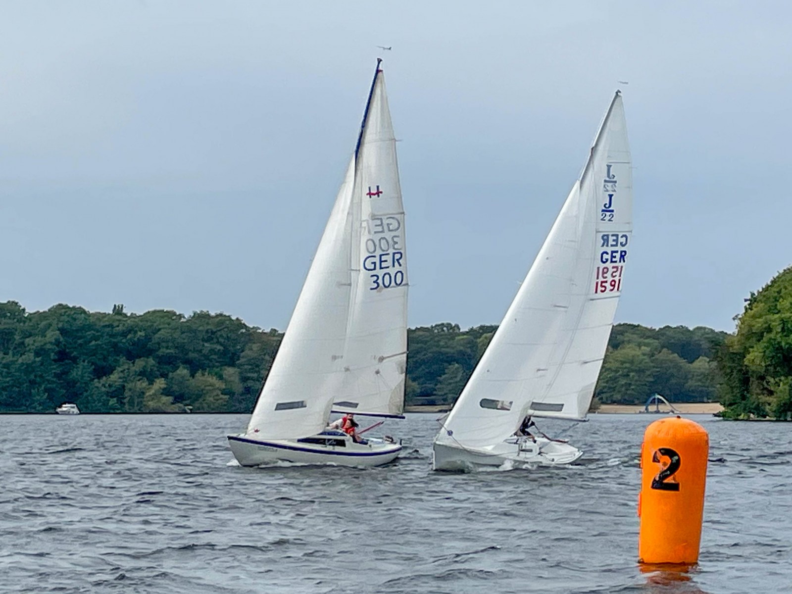 Wettfahrtleiterin Sonja konnte pünktlich um 11 Uhr am Dienstagvormittag die Boote auf den langen Up-&Down-Kurs schicken. Bei optimalen, aber herausfordernden Windbedingungen von 12 bis 18 Knoten wurden zwei Wettfahrten erfolgreich absolviert.