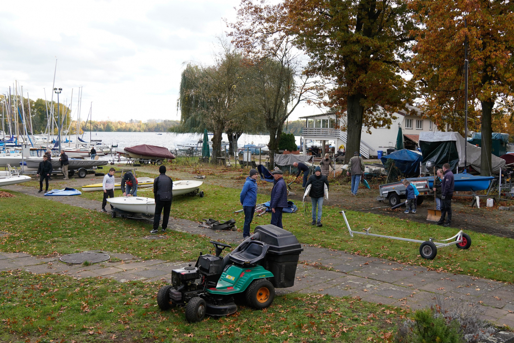 Auch die zahlreichen Mitglieder, die am 4.11.23 zum Arbeitsdienst und Jollenslip erschienen waren, hatten ihre liebe Mühe, über die Laubmassen Herr zu werden.